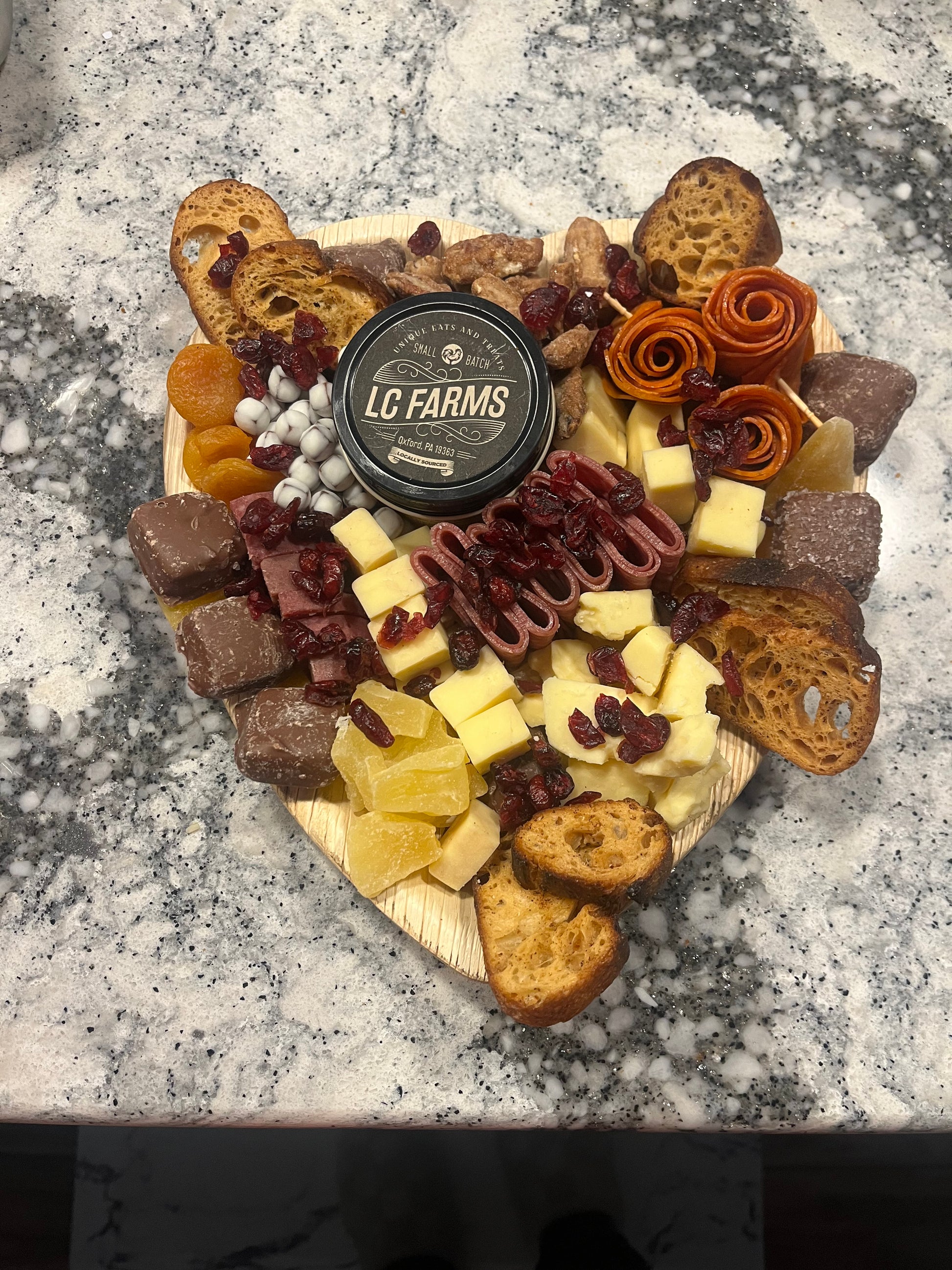 The heart charcuterie board for 5-7 people is a beautifully crafted centerpiece perfect for intimate gatherings or celebrations. The board is shaped like a heart and features an exquisite assortment of artisanal meats paired with a selection of local cheeses. Small-batch local jams add a touch of sweetness, complemented by an array of dried fruits. The board is garnished with vibrant accompaniments and served with crisp crostini for the perfect bite. It’s an ideal way to share flavors and love with friends and family.